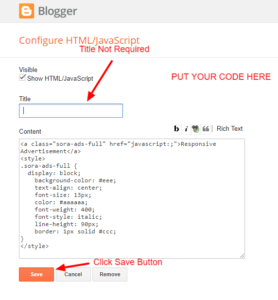 Access your blog Layout > click Add a Gadget > HTML/JavaScript on Sidebar or Footer section, and paste the code below.
